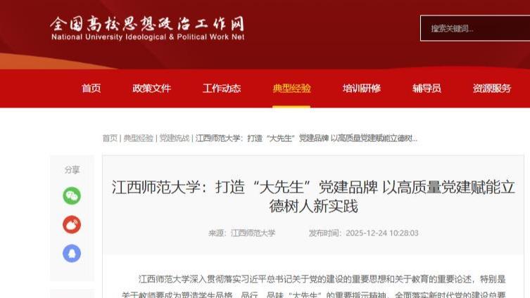 近日,全国高校思想政治工作网及官微以《江西师范大学:打造“大先生”党建品牌 以高质量党建赋能立德树人新实践》为题,全文刊发并重点推介我校深入贯彻落实习近平总书记关于党的建设的重要思想和关于教育的重要论述,将提升党建工作质量与弘扬践行教育家精神深度融合,精心打造“大先生”党建品牌的特色做法与成效。附相关链接:https://www.sizhengwang.cn/a/dxjy_djtz/251224/2299127.shtmlhttps://mp.weixin.qq.com/s/jquS0Ib...