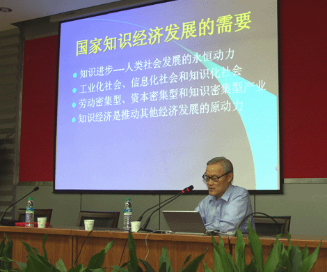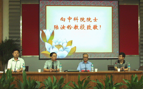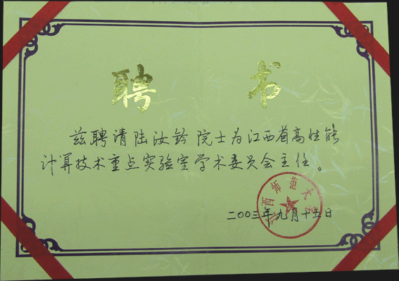本报讯 9月17日上午,我国著名计算机科学家陆汝钤院士在图书馆学术报告厅作了一场精彩讲学。陆院士还欣然从我校党委书记游海手中接过聘书,正式受聘为江西省高性能计算技术重点实验室学术委员会主任。 (本报记者)