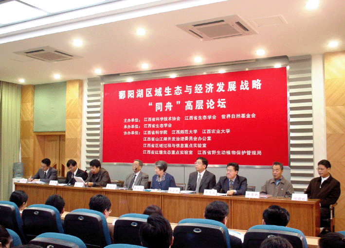 由省科协、省生态协会、世界自然基金会联合主办的鄱阳湖区域生态与经济发展战略"同舟"高层论坛10月24日上午在我校举行,省政协副主席黄懋衡,中国工程院院士、中国生态学生理事长李文华,省科协主席徐俊如,我校副校长余欢等出席开幕式。开次论坛立足鄱阳湖"社会--经济--生态"复合生态系统保护与开发,结合江西省情,针对鄱阳湖区域生态和经济发展的实际,在维护鄱阳湖流域生态系统国家战略定位和履行国际公约、承担国际义务的前提下,以实施鄱阳湖区域生态与经济可持续发展和湿地资源永续利用为目的,提出具有长远战略指导意义和现实应用价值的科学建议。