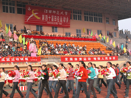 校体育委员会主任、副校长傅修延致开幕辞。裁判员代表、运动员代表分别向大会宣誓。校党委书记、校长游海宣布:"江西师范大学第四十届田径运动会开幕。"
