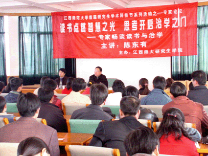 12月16日下午,省委宣传部副部长陈东有博士来我校讲学,综合楼三楼会议室挤满了前来听报告的同学。余欢副校长主持了报告会。在热烈的气氛中,陈东有教授结合自身读书、治学的经历,热情洋溢地为我校研究生作了"读书点燃希望之光,思考开启治学之门"的精彩报告。他回顾了明清历史,从帝王性格与民族兴衰的分析之中,提出当代学生读书与治学的重要性。同时,结合自身求学经历,总结治学经验,他还指出思考是开启治学之门的钥匙,学生不仅要读大量的书,而且要积极思考,在整个讲座中,陈部长旁征博引,引经据点,幽默机智的语言不时引起同学们阵阵喝彩。