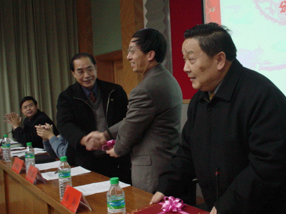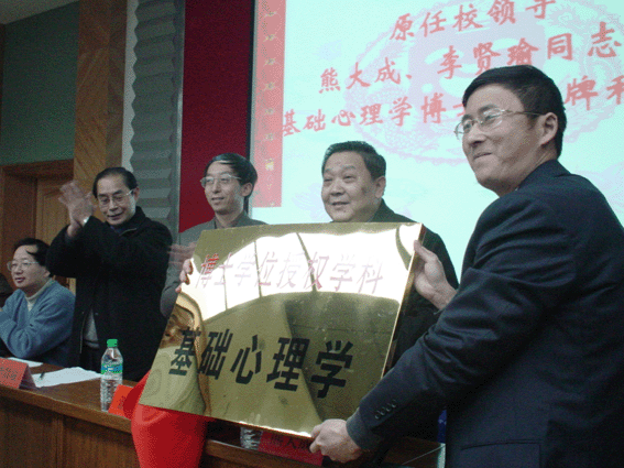 原任校领导熊大成、李贤瑜为我校第一个博士学位授予学科--基础心理学授牌、颁奖,并作了讲话。我校基础心理学学科带头人、博士生导师胡竹菁代表讲话。校长游海为我校申博成功作出重要贡献的两位老领导熊大成、李贤瑜颁发纪念品。