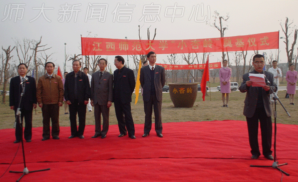 傅修延副校长在奠基仪式上讲话。他说,今天的仪式,在瑶湖校区的建设史上具有深远的意义。"汇聚家乡热土,共建美好校园"这项活动,是一项很好的教育活动,具有非常重要的作用:首先,这是一项重要的爱国主义教育。家乡热土,来自五湖四海,把我们与祖国联系在一起。这有利于我们学生身在校园,心怀天下,开阔了我们的视野;其次,这又是一项重要的爱校活动。通过这项活动,乡土与校园,家园与校园,联为一体,融合在一处。"小杏岭"不但垫高了地面,更重要的是提升了我们的文化品位;再次,这更有利于弘扬我们的教育传统。当前,学校正在讨论"师大精神",抗战烽火中成立的中正大学、首任校长胡先�X以及爱国教授姚名达等,都体现了这种精神。这种精神首先就是爱国主义,其次是海纳百川、兼容并蓄的学术传统,以及追求真理的求真务实的学术品格。