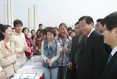 贾庆林主席一行饶有兴致地观看了学校举行的周末文化广场系列活动。在学生心理咨询、成长导航、勤工俭学等活动台前,贾庆林与师生们亲切交谈,详细了解学生的学习、生活和思想道德建设情况。当听说学校通过为学生提供勤工俭学岗位,采取奖学金、助学贷款等各种方式帮扶家庭困难学生,保证了他们顺利完成学业时,贾庆林不住地点头。考察中,贾庆林对南昌高校新校区高速度、高质量,运用市场运作手段建设具有特色的校园新区给予了充分肯定。