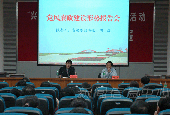 4月16日下午3时整,我校在图书馆报告厅举行党风廉政建设形势报告会,省纪委副书记胡波应邀作报告。胡波副书记就我国反腐倡廉的形势、任务与对策作了论述。校党政领导游海、眭依凡、曹达忠,校长助理欧阳忠详,全校副处以上干部、各附属单位主要负责人、各院级党委(党总支)、直属党支部纪检委员出席报告会。 胡波副书记在报告中指出,我国在反腐败斗争中标本兼治,取得显著成效,但任务仍然艰巨。