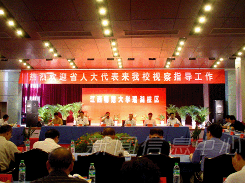在艺术楼会议室,代表们听取了漆权厅长作的江西高等教育发展状况和李小南副书记所作的高校新园区建设的情况汇报。人大代表发了言,李立功代表说,这是我第三次来师大瑶湖校区视察,每次来都有新的感受,每次来都很振奋,新校园区二期工程基本完成,确保了今年新生入学有一个较好的环境,瑶湖新园区创造了江西速度,江西奇迹,基本上未用政府投资,作出了一流的成绩,也给其它各行各业作出了榜样,希望新校园区在省委省政府领导下,发展得更好,为江西经济发展提供智力支持。