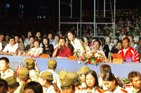 弦歌又起瑶湖畔,火树银花不夜天。9月23日晚,2004级新生开学典礼的礼炮硝烟尚未散尽,迎新晚会的焰火又再次在瑶湖校区正大广场升腾,一场集欢迎新生、喜迎奥运冠军凯旋的大型文艺晚会,在这里隆重举行。校领导游海、蔡�霭病㈨跻婪病⒆;坪印⒏敌扪印⒔�凤池、余欢,省政协常委李贤瑜,校长助理欧阳忠详、张平熊大冶,奥运冠军彭勃携父母,我校04级新生、奥运冠军杨文军及其教练彭浩,学校各院系处室有关领导、教师代表、瑶湖校区新老生约6000余人观看了晚会。
