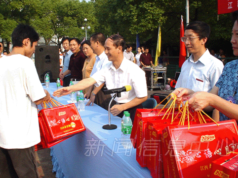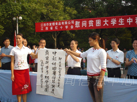 中秋月圆夜,万家欢聚时。9月28日下午,江西乔家栅食品有限公司、江西省红十字会来到我校,向贫困学子发放中秋食品,送上一份节日的关爱和祝福。乔家栅食品有限公司董事长邓爱群、省红十字会专职副会长方娅,我校党委书记、校长游海,校长助理欧阳忠详出席了在红场举行的发放仪式。