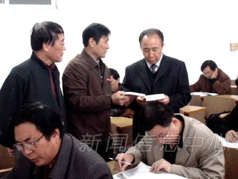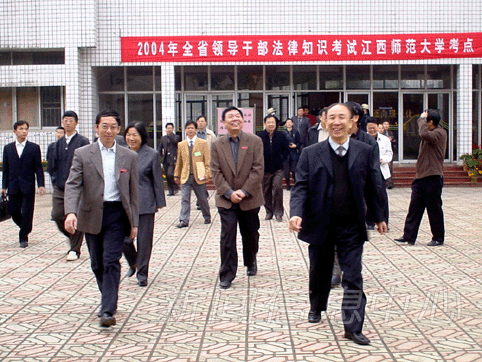 11月13日,由省委组织部、省委宣传部、省司法厅联合组织的2004年江西省领导干部法律知识考试在全省11个设区市和省直部门同时举行,全省共有12万余名领导干部参加了考试。省委副书记彭宏松、省人大常委会副主任孙用和、省政协副主席金异对江西师大考点进行了视察。校领导游海、蔡�霭病⒆;坪拥仍谧酆下デ坝�候彭宏松一行。