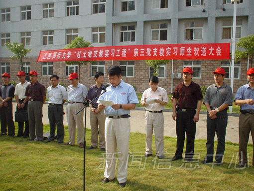 余副校长代表校党委、行政对参加此次实习的师生表示由衷的敬意并提出殷切希望。他说,我校推出的"红土地支教实习工程"有利于缓解农村师资的短缺,提高农村教学质量,有利于同学们了解中学的教学实际,增强自我的教学能力,同时也有利于推动我校人才培养模式的改革。在谈到农村的艰苦条件时,他希望同学们要勇于面对挑战,认识到实习是整个学习中的一环,认真工作,努力学习,自觉维护学校的形象,投身到教育改革的大潮中去。
