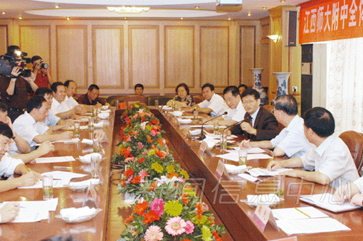 听取我校及附中的情况汇报后,孟建柱书记发表重要讲话。他说,江西师范大学这几年的变化非常大,成绩有目共睹。瑶湖新校区的建设是学校运用资本经营的理念,完全靠市场化运作建成的,省里只在政策和土地等方面给予了一定的支持。而师大附中作为一所省属优秀重点中学,它的办学经验和办学成就,决定了它理所当然地成为江西基础教育的一个响亮的品牌。