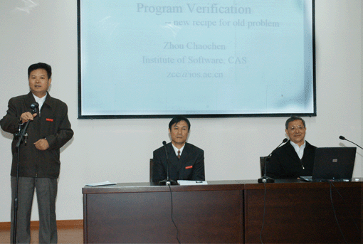 周巢尘院士对我校的热情接待表示感谢。他给在座的师生们作了计算机程序验证方面的学术报告。整个报告深入浅出,形象生动,让听众获益匪浅。