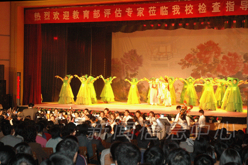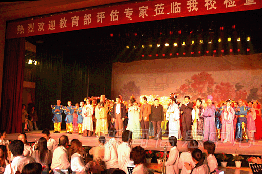 演出结束后,教育部评估专家组组长赵彦修教授,副组长万洪文教授,副校长余欢,校长助理熊大冶一同走上舞台与演职员握手,祝贺演出成功并合影留念。