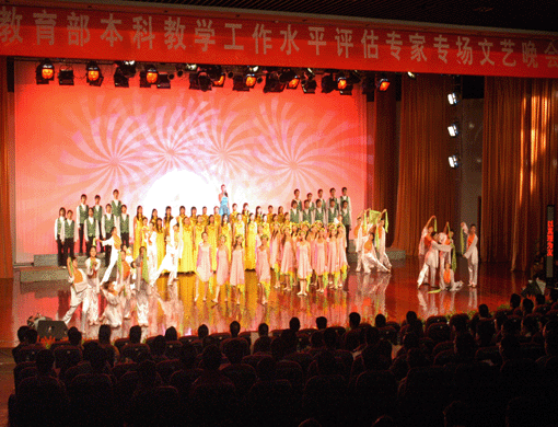 当晚,为欢迎教育部评估专家组的专场文艺晚会在瑶湖校区实验剧场隆重举行。晚会以《走过岁月》拉开序幕,精彩纷呈的歌舞节目充分展示了我校建校65年悠久的办学传统、深层的文化传承和昂扬奋发的精神面貌,赢得了全场热烈的掌声。专家组全体成员在省政府副秘书长郑克强,省教育工委副书记、省教育厅副厅长李小南和我校领导的陪同下,兴致勃勃地观看了演出,并与演员们合影留念。