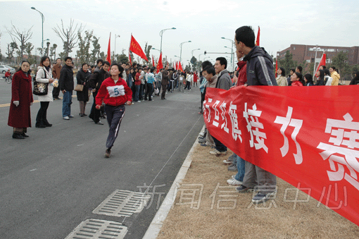 3:30,随着校长助理欧阳忠详一声“各就各位,预备――跑!”的发令,拉开了本次接力赛的序幕。各学院的第一棒队员争相恐后地朝前冲去,“加油!”的声音在四个接力点沸腾开来,健将们的身影成为校园里一道亮丽的风景,很多同学都停留下脚步,加入到啦啦队的阵容中,关注着这场特殊的比赛。校助欧阳忠详一直站在跑道边给同学们加油,他说:“很高兴能够担任今天比赛的发令手,这样的活动能够振奋全校的精神,齐心协力共迎崭新的2006年,为我校迎接一个新的发展局面。”