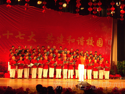 整台晚会洋溢着欢快、祥和、热烈的气氛。离退休老同志、在职教工、大中小学生、幼儿园小朋友同台演出。节目精彩纷呈,赢得了阵阵掌声。大合唱《和谐中国》、独唱《夕阳红》、舞蹈《今年咱家喜事多》彰显了和谐的主题,唱响了和谐发展的赞歌,弘扬了我们中华民族"敬老、爱老、护老"的优秀品质,展现了师大人的精神风貌,表现了全校师生员工沿着"十七大"指引的路线,在校党委、行政的领导下,科学发展,构建和谐校园,建设美好明天的气概和决心。(文/图 离退休工作处 刘小平)