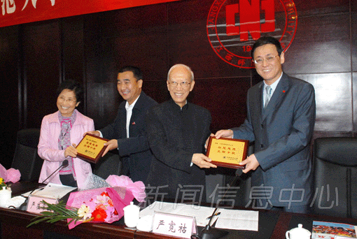 眭依凡校长代表学校向福慧慈善基金会赠送镌有"福慧慈愿、光耀千秋"铜牌以资纪念,另赠一帧由美术学院教授刘赞爱书写的长卷--王安石《调寄望江南・三皈依》,当严宽祜先生接过礼品,并展开长卷时,会场再次响起热烈的掌声。詹鸿生处长在掌声中朗声颂读长卷全文:"皈依众梵行、四威仪,愿我遍游诸佛土,十方贤圣不相离,永灭世间痴;皈依法,法法不思议,愿我六根常寂静,心如宝月映琉璃,了法更无疑;皈依佛,弹指越三�o,愿我速登无上觉,还如佛坐道场时,能智又能悲。"