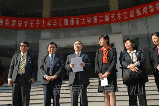 当天下午,泰国宋卡王子大学与江西师范大学第二届艺术交流画展开幕式在青山湖校区美术馆举行,画展展示了宋卡王子大学美术与应用艺术学院师生们的130幅作品。宋卡王子大学来宾以及学校二百余名师生代表参加了开幕式。副校长曹达忠为画展开幕致辞,他简要回顾了两校的合作与交流,表示相信本次画展将使我校师生进一步了解泰国的民族艺术及宋卡王子大学艺术理念和特色。