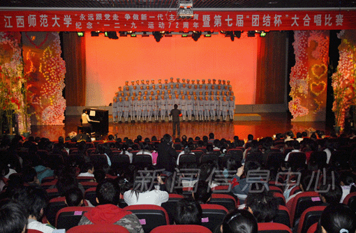 我校两年一届的"团结杯"大合唱比赛是学校的一项传统校园文化活动。今年的比赛以"永远跟党走,争做新一代"为主题,以纪念"一二・九"运动72周年为契机,旨在通过主题突出、格调高雅的大合唱比赛,把广大青年学生的思想统一到党的十七大精神上来,使广大青年学生努力按照胡锦涛总书记"四新一代"要求,坚定跟党走中国特色社会主义道路的信念。比赛由校团委、音乐学院共同承办,除音乐学院外其他21个学院参加比赛,音乐学院派出了专业学生担任各参赛学院的排练指导、指挥和伴奏。经过数个月精心准备,各学院合唱团为现场观众呈现了一场精彩的音乐盛会。
