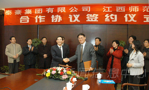 1月11日下午,我校与泰豪集团有限公司校企合作签字仪式在知行楼举行。我校校长眭依凡、泰豪集团有限公司董事长黄代放在签字仪式签署协议:双方将在培养动漫人才、开发动漫产品、建设动漫产业基地以及科技开发、企业经营管理等领域展开全面合作。泰豪还捐资110万元在我校设立"泰豪特等奖学金"和 "泰豪动漫奖学金",并资助成立"江西师范大学泰豪大学生艺术合唱团"。