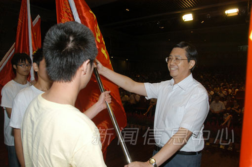 出席会议的领导为获得 2008 年度全省先进单位和个人颁奖,蒋如铭为即将出征参加 2009 年“三下乡”社会实践活动的重点服务队授旗并讲话,他希望社会实践活动各组织单位要加强领导,搞好协调,完善方案,精心操作,务求实效;希望广大志愿者们在参与社会实践活动当中确实得到锻炼,得到提高。他勉励参加社会实践的师生要虚心向农民群众学习,增强群众感情;要善于向其他队友学习,培养团队精神;要发扬志愿者的精神,培养好的作风。