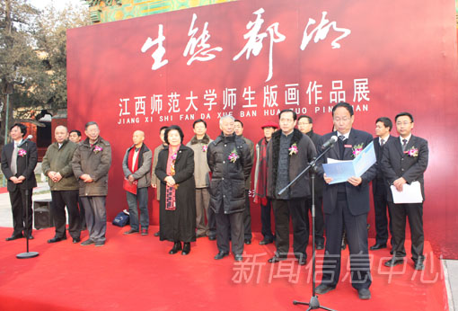12月12日,正值国务院批复“鄱阳湖生态经济区”成立一周年,由江西师范大学主办、科技学院承办的“生态鄱湖——江西师范大学师生版画作品展”开幕式在北京孔庙和国子监博物馆举行。