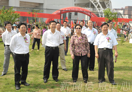 在鞭炮声和热烈的掌声中,孙刚和史蓉蓉共同为我校新建的大学生心理素质拓展基地揭牌。