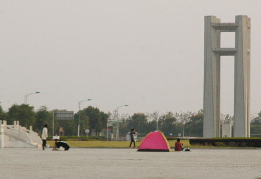 下午一点多,正是一天中日照最强的时候。穿一件长袖秋装在太阳底下走,不一会儿额头上就沁出细细的汗珠。这个时候正大广场上几乎没什么行人,灰白色的石板地面在太阳强光照射下,白茫茫一片。远远望去,那一顶帐篷就像漂浮在水面上的"孤岛"。