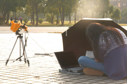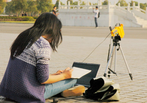 "83.1wbb,74.7sam……"一串串数据从这个身穿白色针织衫的女孩口中传出,她叫汤林玲,是我校地理学院研二的学生。在她三四米远的地方,是来自2009级地理信息系统专业的冯桂英,此刻小冯正蹲在一把太阳伞下,对着笔记本电脑一边看温度,一边记下小汤报出的数据,与电脑相连的,是一台温度测量仪。