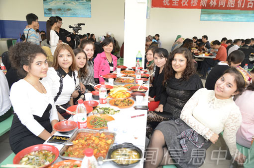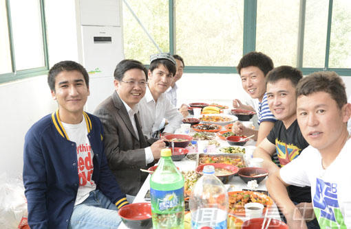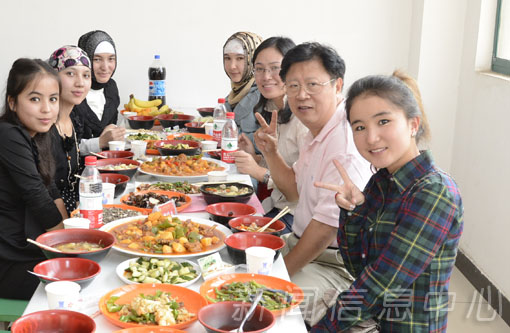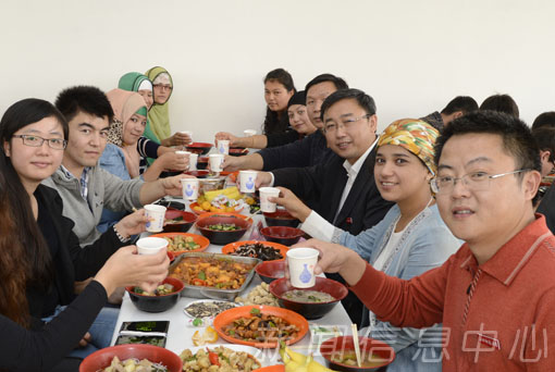 陈绵水发表了热情洋溢的讲话,他代表学校全体师生向所有穆斯林同学致以真挚的节日祝福,祝福他们生活愉快,学习进步,祝愿他们在学校健康成长。梅国平向同学们表达了节日的祝贺和亲切的慰问,希望大家度过一个愉快的古尔邦节。宴会中,学生代表为参加宴会的领导和教师献上了最富民族特色的帽子,以表达他们最诚挚的谢意。在优美的音乐声中,领导们热情地与穆斯林学子共舞。熊大冶的一曲高歌更是把宴会气氛推上高潮。