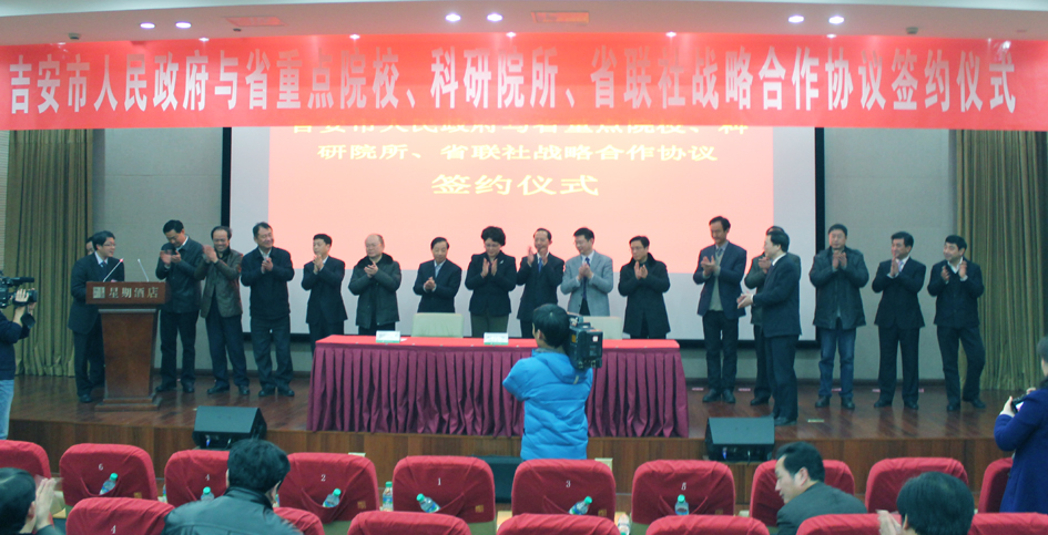 1月24日,吉安市人民政府与包括我校在内的省重点院校、科研院所、省农信社等9家单位签署战略合作协议。校长梅国平代表我校出席仪式并在合作协议书上签字。此举标志着吉安与省直单位在人才、科技、金融等方面搭起了便利的沟通之桥、友谊之路、合作之道,对建设开放繁荣秀美幸福新吉安具有重要意义。