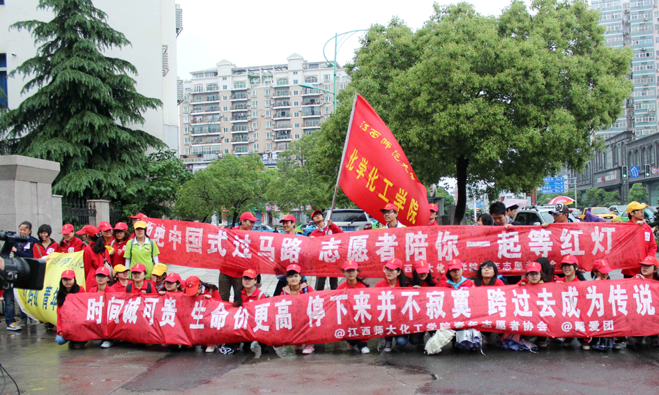 “停下来并不寂寞,跨过去成为传说”。4月20日、21日两天,来自我校化学化工学院的两百多名志愿者,冒雨来到南昌市区南京路口。志愿者们分成4队,分别站在4个人行红绿灯处,拉起横幅,用身体筑成人墙陪行人一起等红灯,提醒市民遵守交通规则。