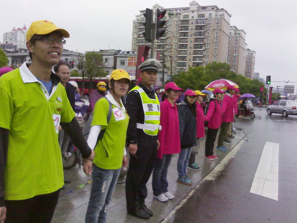 一番叮嘱后,志愿者们开始了工作。他们手拉着手筑成一道人墙,陪市民一起在风雨中等红灯。在活动过程中,市民们都主动配合志愿者工作,还有好心的市民,给志愿者们送来了雨衣和食物,给风雨中的志愿者带来了一丝温暖。