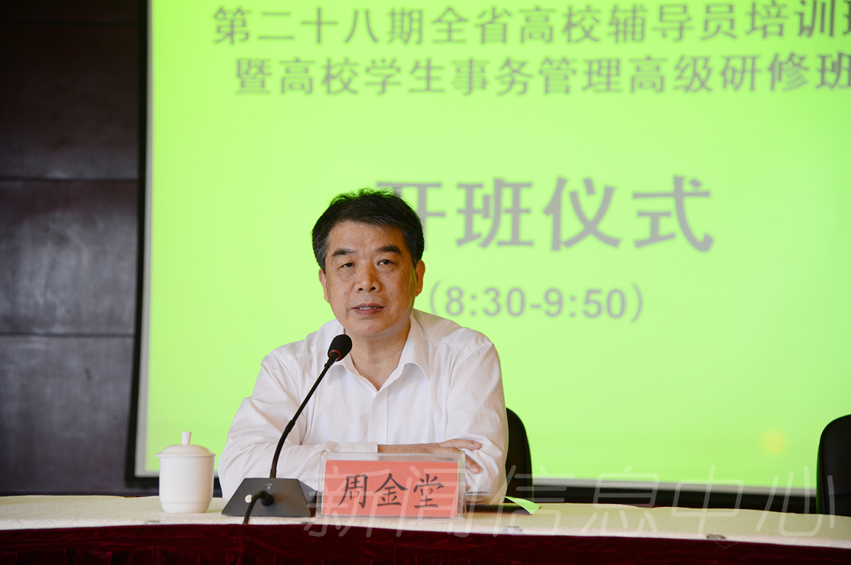 周金堂在开班仪式上讲话。他指出,辅导员培训是贯彻中央十六号文件的需要,是实现“中国梦”、提升大学生思想政治教育成效、加强辅导员队伍建设的有效途径。他强调,党中央高度重视辅导员队伍建设,辅导员自身更应当提升自信,提高责任意识和使命意识;其次是要全面提升辅导员自身的能力和素质,做到德才兼备、爱岗敬业,时刻以学生为本,为学生说话,为学生做事。他希望参加培训的辅导员注意转变角色,以学员的身份要求自己,认真学习,遵守纪律,加强交流,在培训中有所学有所长。