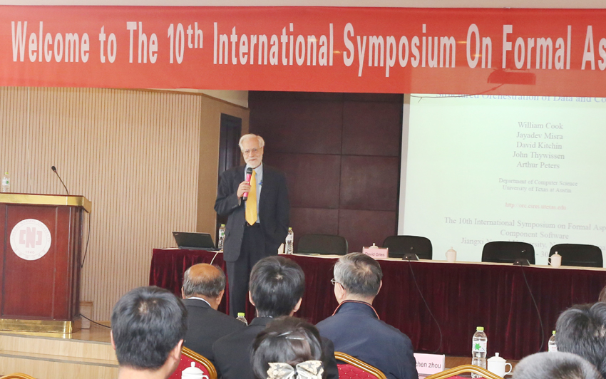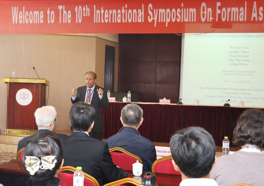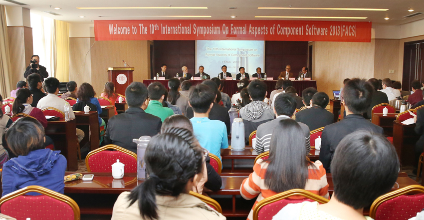 10月28日,第十届构件化软件形式化方法国际研讨会开幕式(简称“FACS 2013”)在我校国际学术交流中心举行。中国科学院院士周巢尘、美国康奈尔大学著名教授David Gries、美国德克萨斯大学奥斯汀分校知名教授Jayadev Misra、英国伦敦大学皇家霍洛威学院José Luiz Fiadeiro教授和英国伯明翰城市大学Zhiming Liu 教授出席会议。来自法国弗朗什孔泰大学、意大利博洛尼亚大学、德国亚琛工业大学、英国利物浦大学、法国国家信息与自动化研究所、荷兰埃因霍温理工大学、丹麦奥尔堡大学、德国慕尼黑工业大学、意大利佛罗伦萨大学、捷克马萨里克大学、北京大学、中国科学院和华东师范大学等国内外知名院校的专家、学者参加了会议。