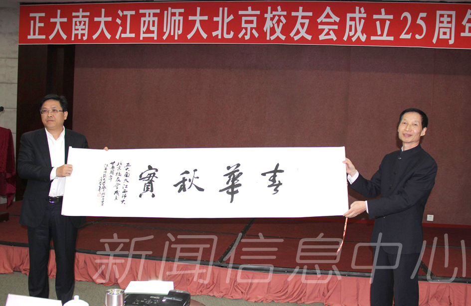 梅国平代表母校向北京校友会成立25周年赠送了贺礼,并盛情邀请在京校友常回母校看看,继续关心和支持母校建设,创造江西师大发展新的辉煌。