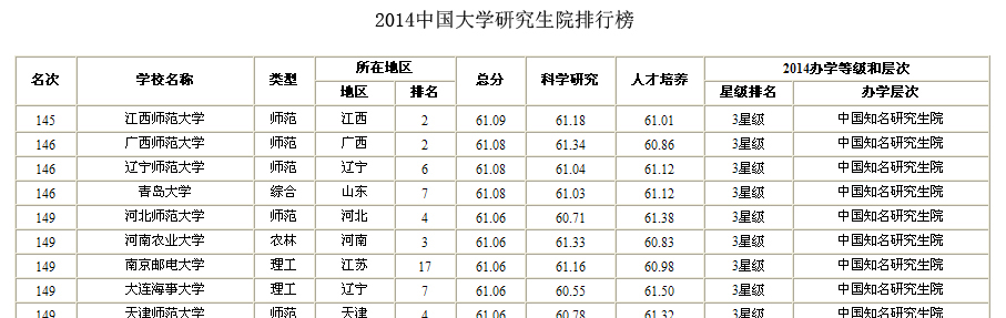 11月中旬,校友会网公布了2014中国大学研究生院排行榜,我校研究生教育列全国第145位、全省第2位,荣膺三星级研究生院美誉;在武汉大学中国科学评价研究中心发布的研究生教育竞争力排行榜中,我校研究生教育列全省第2位(全国182位);我校化学学科再次进入ESI前1%学科,并获准设立博士后科研流动站;7月中旬,我校申报的金融硕士、社会工作硕士、会计硕士、旅游管理硕士等4个硕士专业学位授权点成功获批,数量位居全省第一。