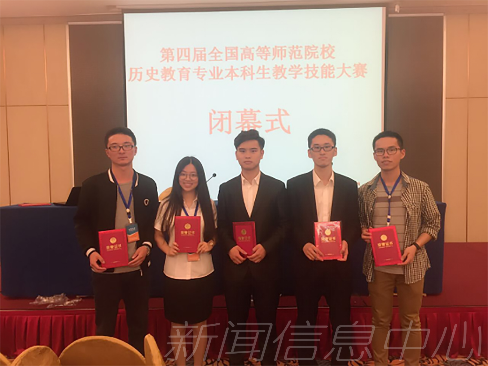 近日,第四届全国高等师范院校历史教育专业本科生教学技能大赛在我校闭幕。我校2013级历史学专业刘波、吴虚怀等5 位参赛学生,充分展示了我校师范专业学生良好的专业素养和扎实的教学基本功,获得大赛评委和专家的一致好评,5位参赛学生全部获奖。其中,刘波、吴虚怀分获说课组和讲课组一等奖,袁羽、巫鑫灏分获说课组和讲课组二等奖,李王辉获说课组三等奖,获奖等级和数量位居参赛高校第一,也是我校学生在本项竞赛中获得的最好成绩。同时,学校获优秀组织奖,赵玉洁获优秀指导教师奖。