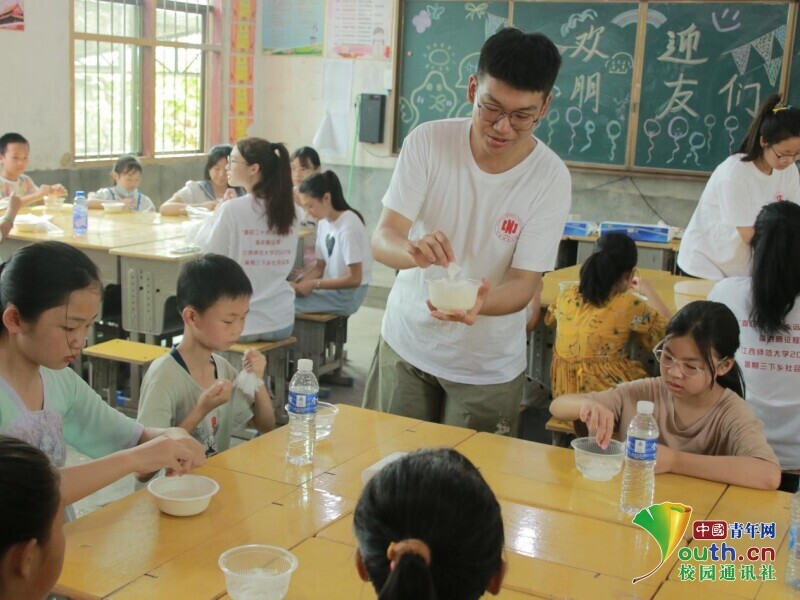 图为队员为小朋友们示范制作纸浆,队员每组依次向小朋友们展示,指导小朋友们正确的步骤。中国青年网通讯员 龙媛媛 摄