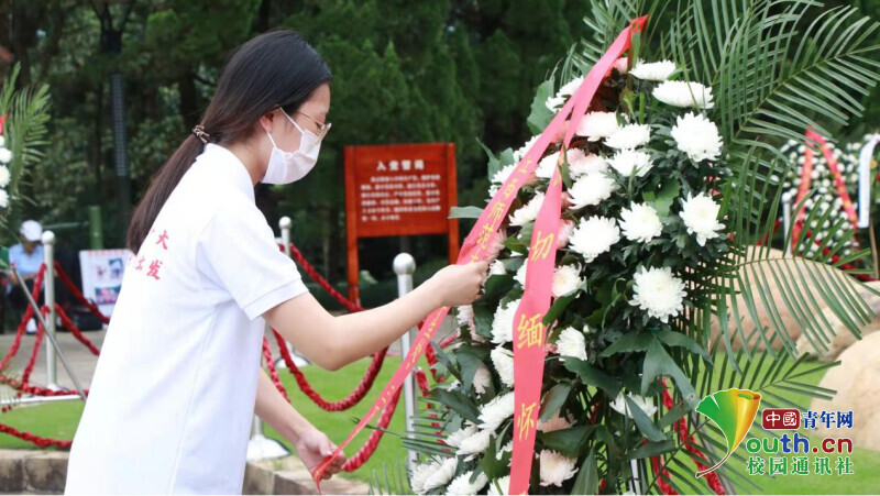 图为实践队学生代表向胡耀邦同志敬献鲜花。中国青年网通讯员 何颖 摄