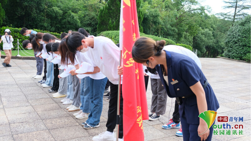 图为实践队成员向胡耀邦同志敬献鲜花后鞠躬,以缅怀先烈。中国青年网通讯员 何颖 摄