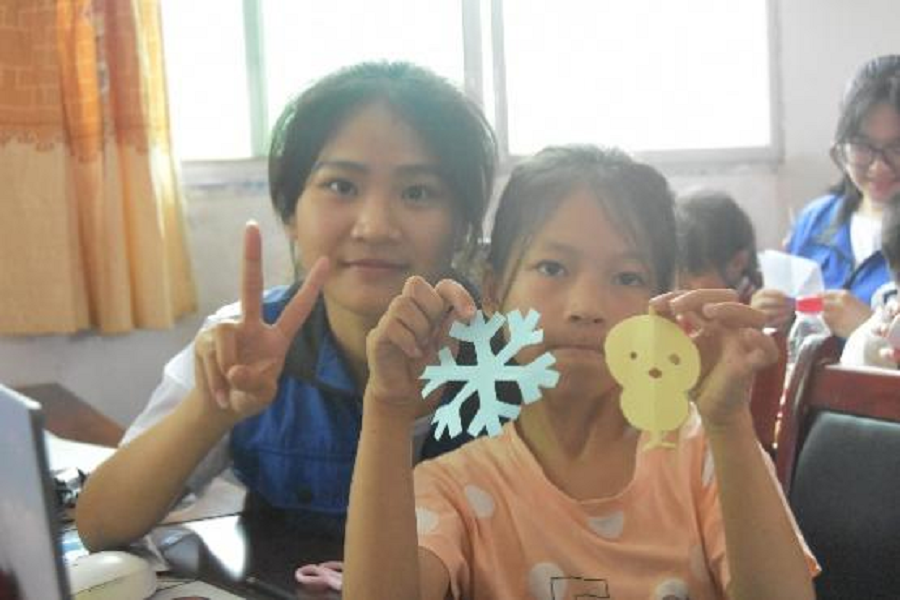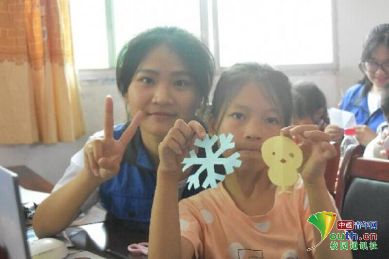 图为实践队队员和小朋友在剪纸。中国青年网通讯员 龙暄颖 供图