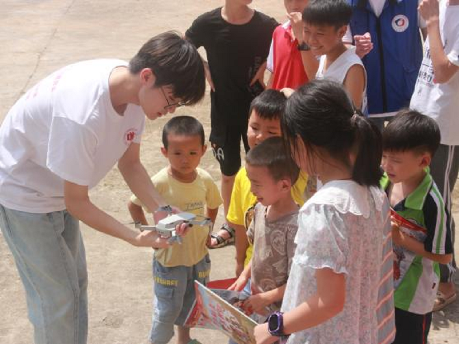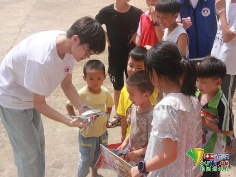 图为实践队队员为小朋友讲解无人机的知识。中国青年网通讯员 龙暄颖 供图