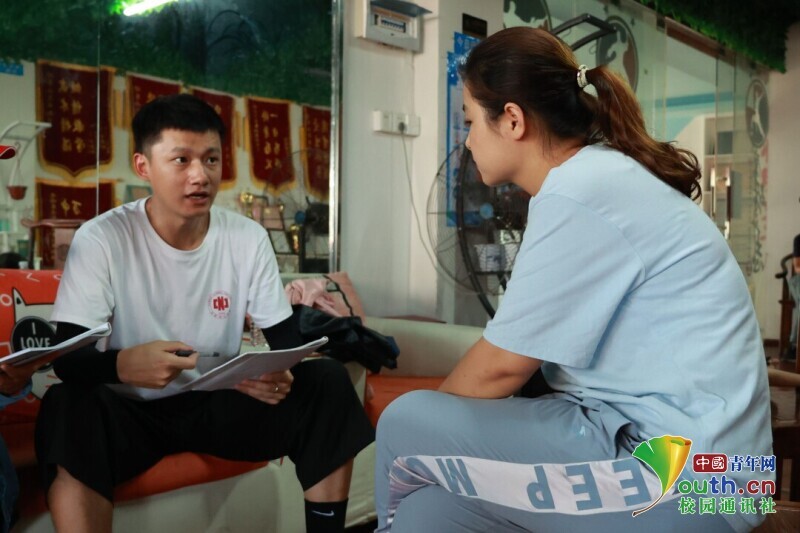图为实践服务队成员询问工作人员武馆的开办历史、教学规模、招生生源和学员们的学习情况以及对于武馆的远景规划。中国青年网通讯员 张稳健 摄