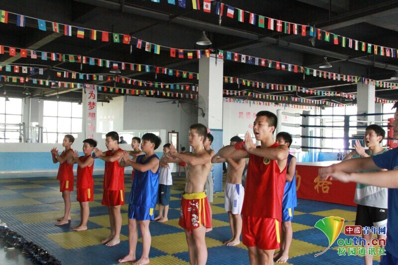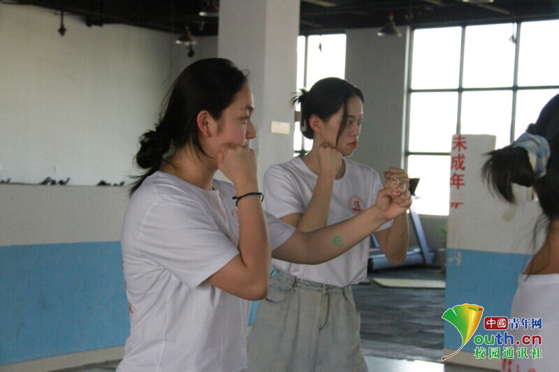 图为社会实践服务队队员在教练的带领下进行散打基础动作学习。中国青年网通讯员 万雯思 摄