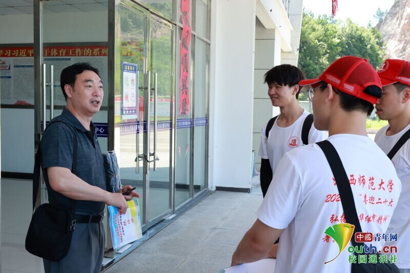 图为社会实践服务队队员对余干县全民健身中心领导进行采访。中国青年网通讯员 张稳健 摄