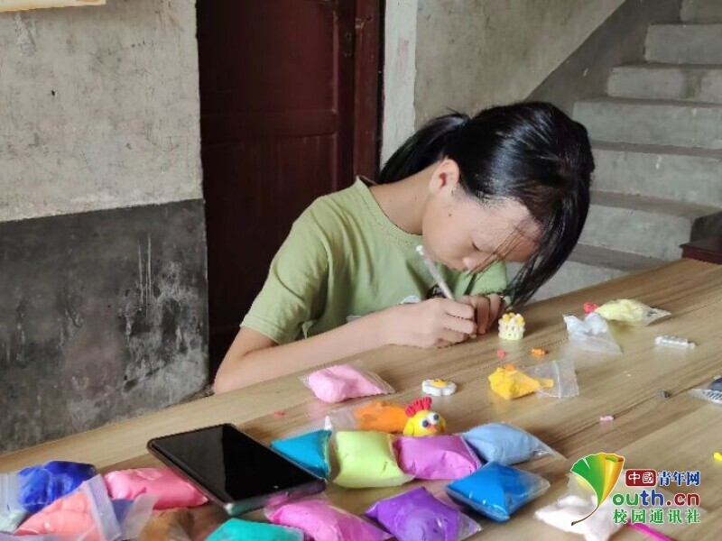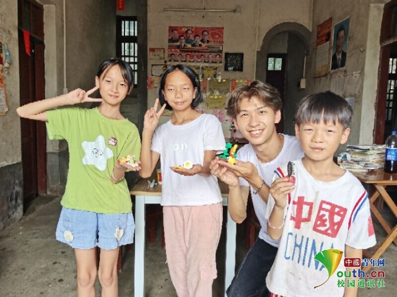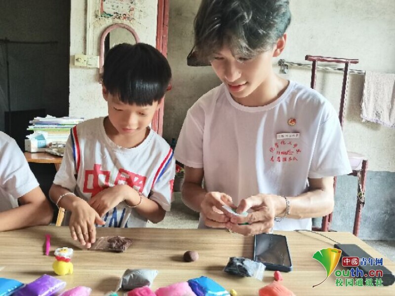 图为实践队员在教小朋友做手工。色彩鲜艳的粘土经过雕琢,筑成了孩子们心里的梦。中国青年网通讯员 黄铄 供图