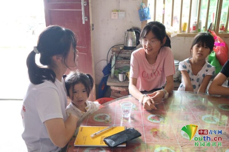 图为实践队员与孩子们畅谈,心与心的交谈让孩子们露出了真挚而又开心的笑容。中国青年网通讯员 田瑞婷 供图