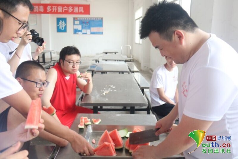 图为防洪演练结束后,指导老师和实践队员一起吃西瓜。中国青年网通讯员 周柳烨 摄