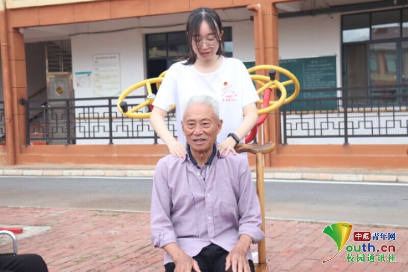 图为实践队员边和老人交谈,唠唠家常,边给老人们按摩。中国青年网通讯员 邓召坪 供图